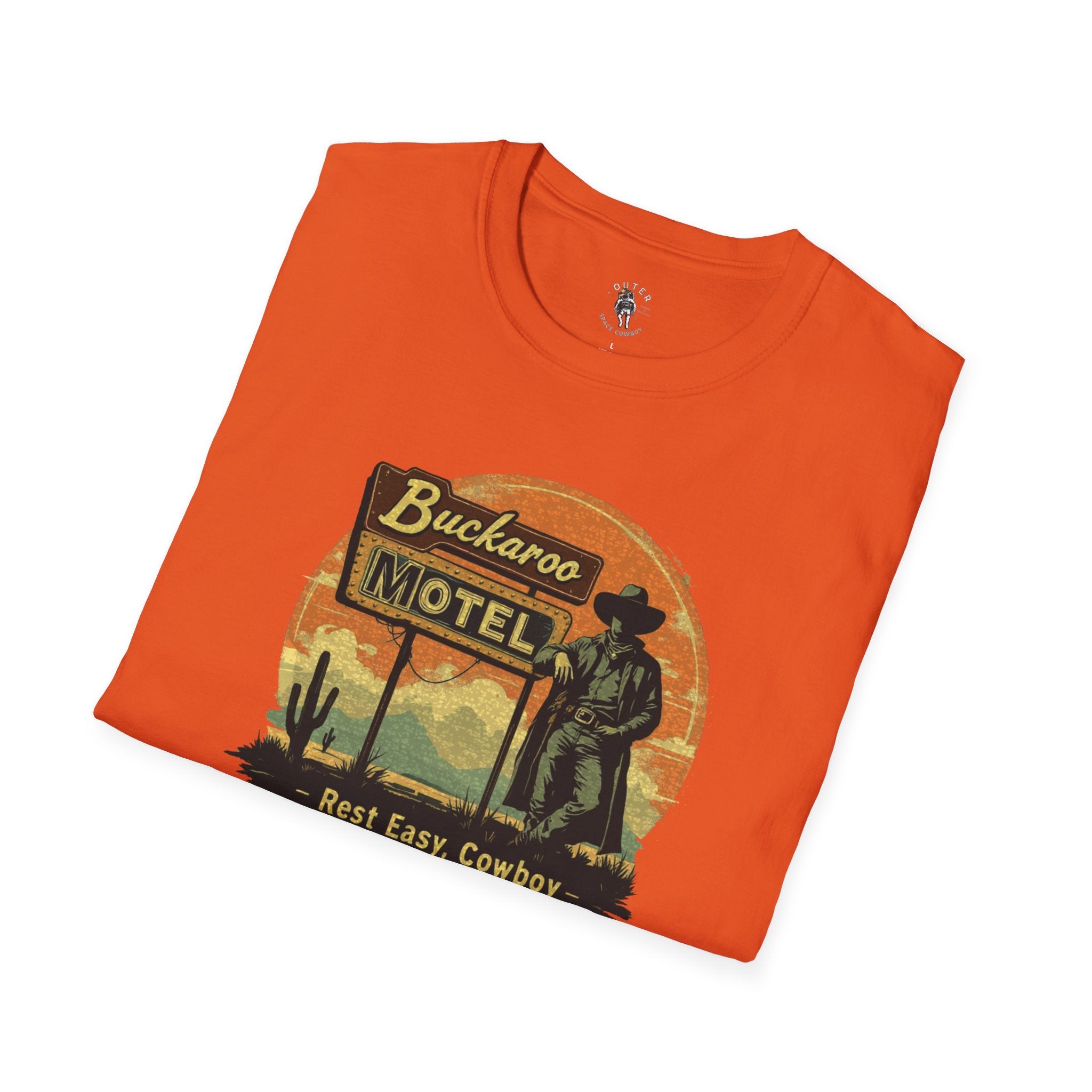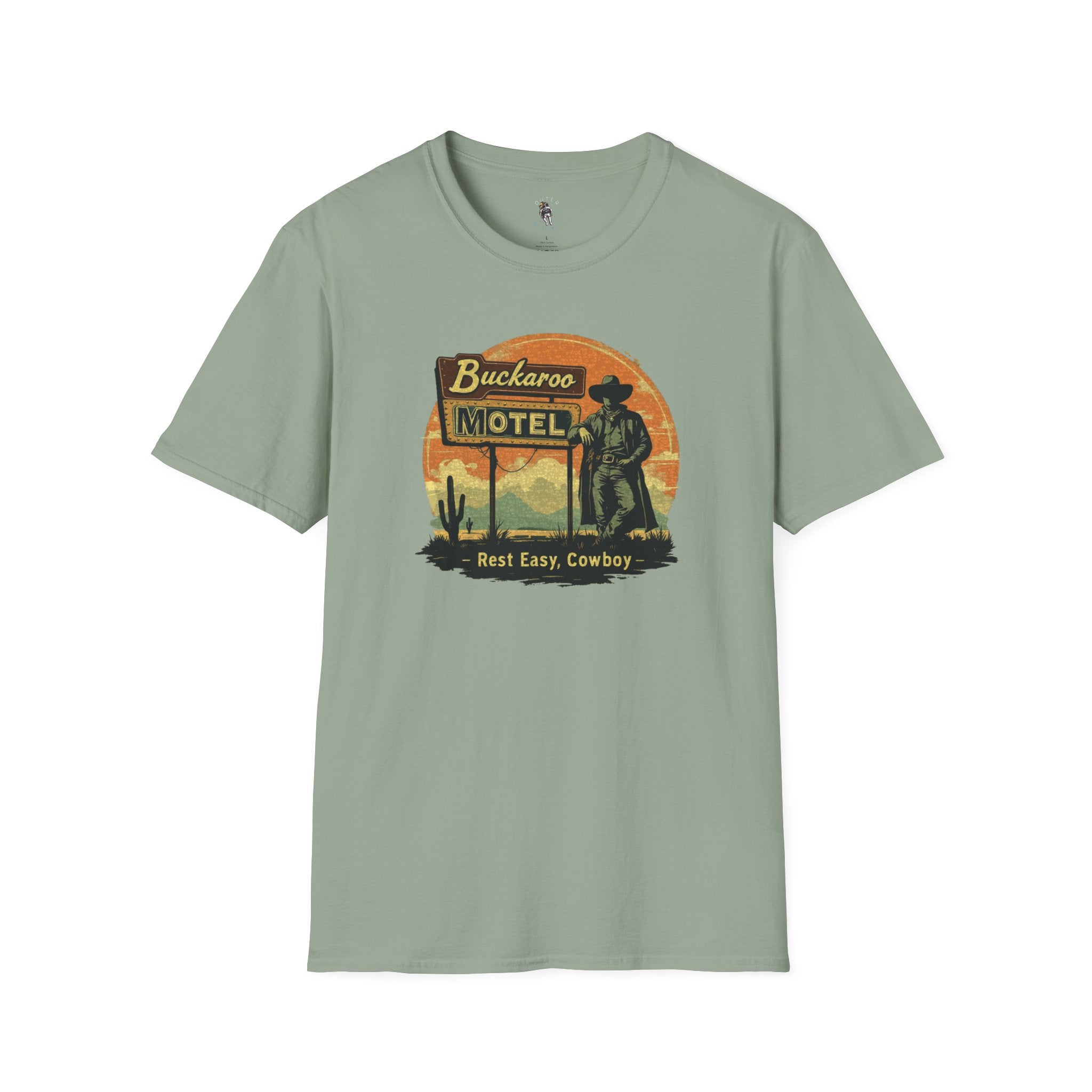 Vintage Western Design: Showcasing a retro motel sign with the slogan "Buckaroo Motel – Rest Easy, Cowboy," this tee captures the timeless essence of roadside Americana.