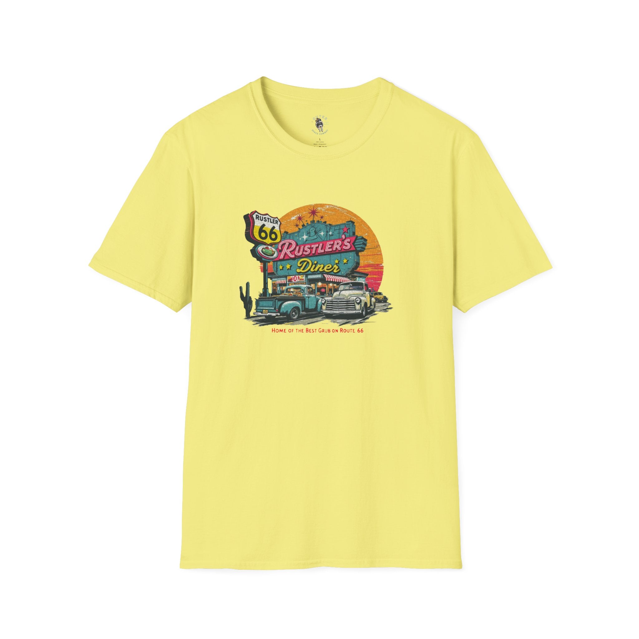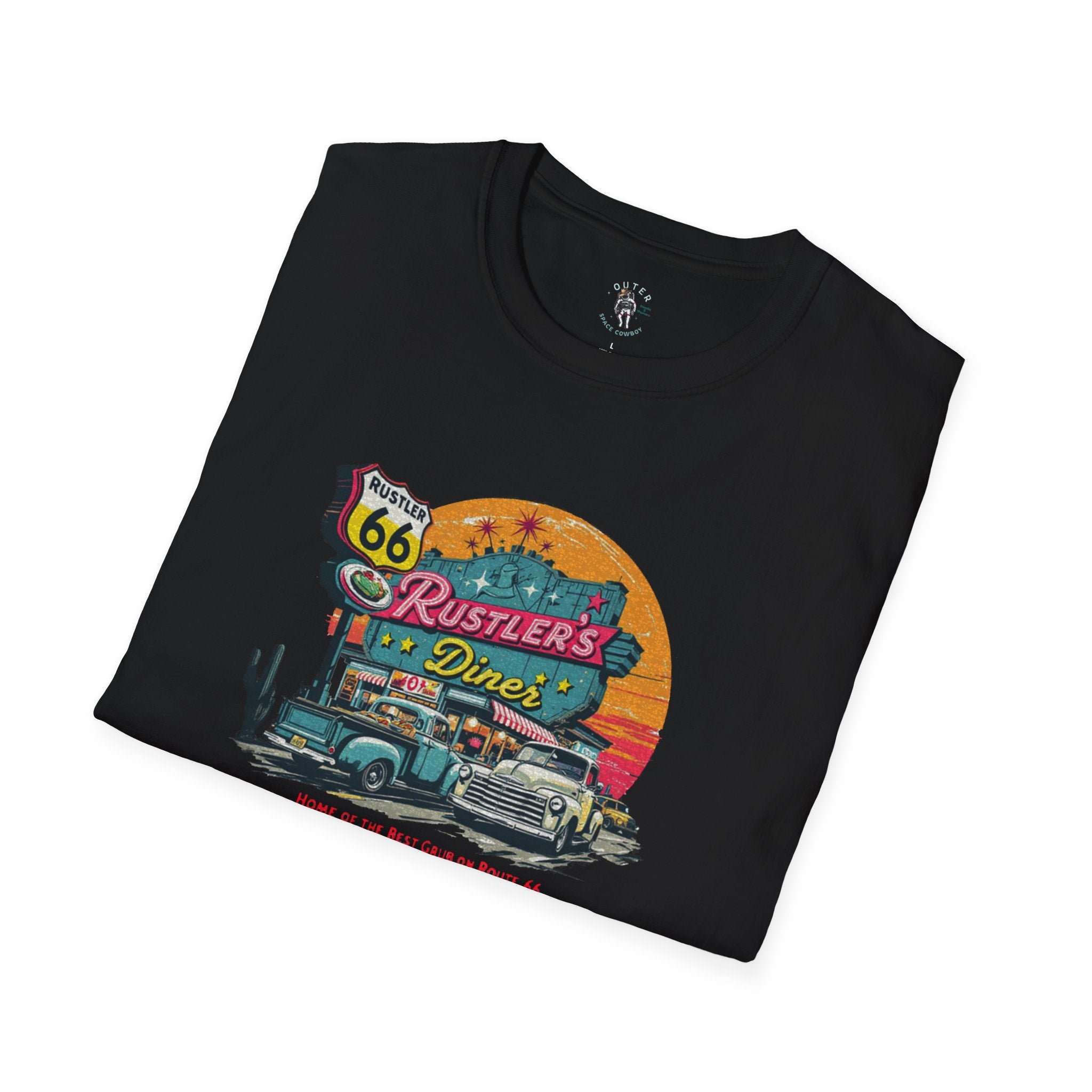 Retro Western Design: Showcasing a vintage diner graphic with classic pickups and the bold "Rustler’s Diner – Home of the Best Grub on Route 66" slogan, this tee is a tribute to the West's iconic roadside stops.